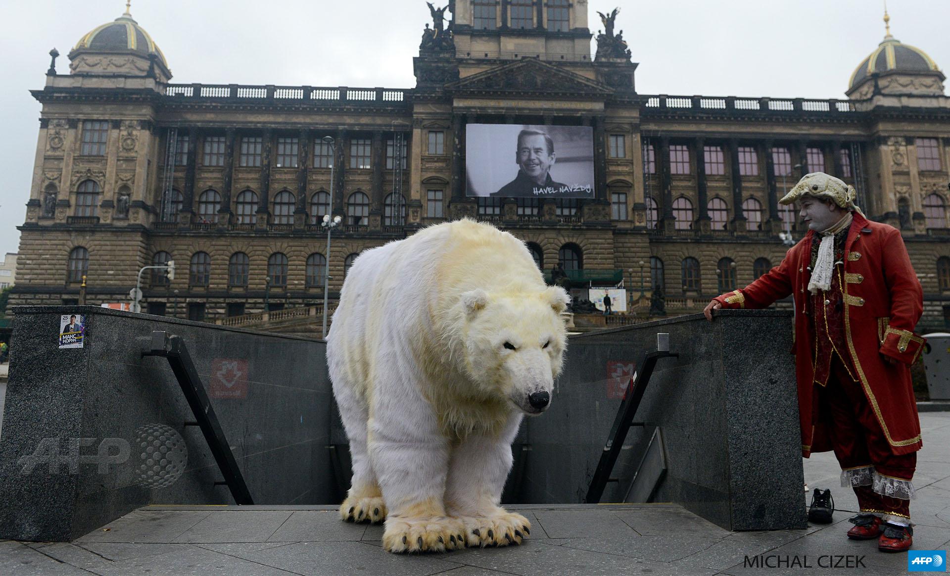 A Greenpeace activist dressed like a polar bear poses in front of the National Theatre in Prague #AFP